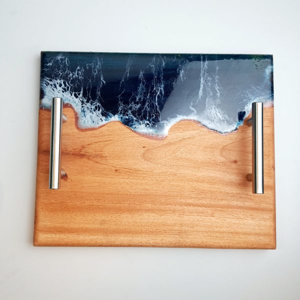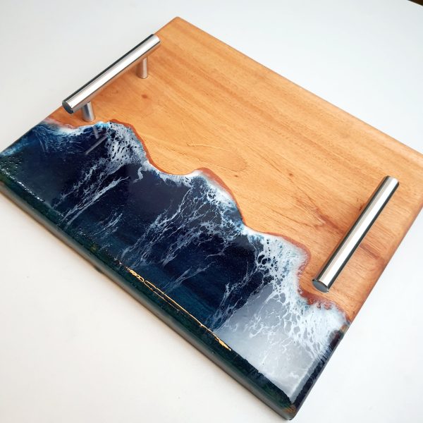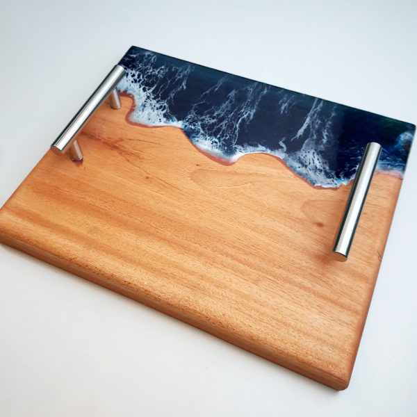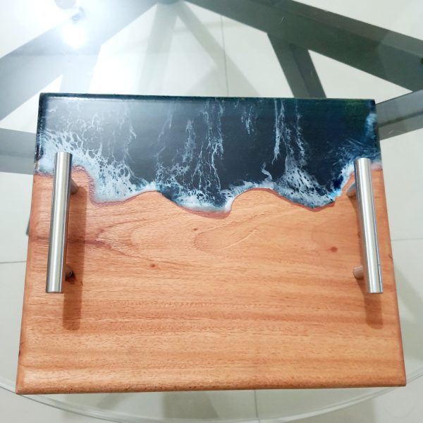 Handmade with premium mahogany wood and ocean-inspired epoxy resin, this serving tray is both durable and elegant. Featuring steel handles, it’s perfect for serving, home décor, or as a unique gift.